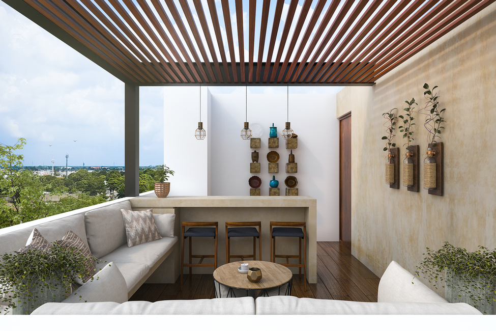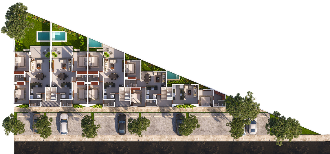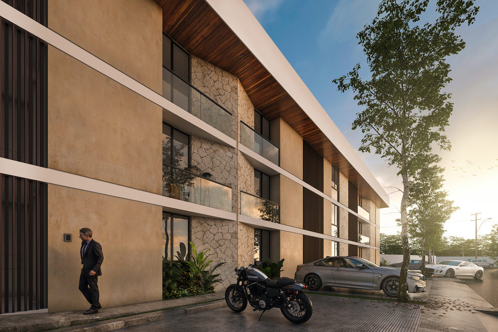 Belia es un complejo de 15 departamentos, el edificio consta de 3 plantas con 5 departamentos en cada planta, los departamentos de planta baja tienen jardín exterior y piscina, los de segunda planta tienen un balcón amplio y de los de tercera planta 3 de ellos son penthouse con roof-garden con baño y Family room, estos tienen doble altura, El desarrollo cuenta con cuarto de basura para evitar acumulación de olores y animales. Se implementaron arboles en el estacionamiento para hacer sombra y sumar mas vegetación, todos los departamentos cuentan con interfon, su propia cisterna y su propio tinaco