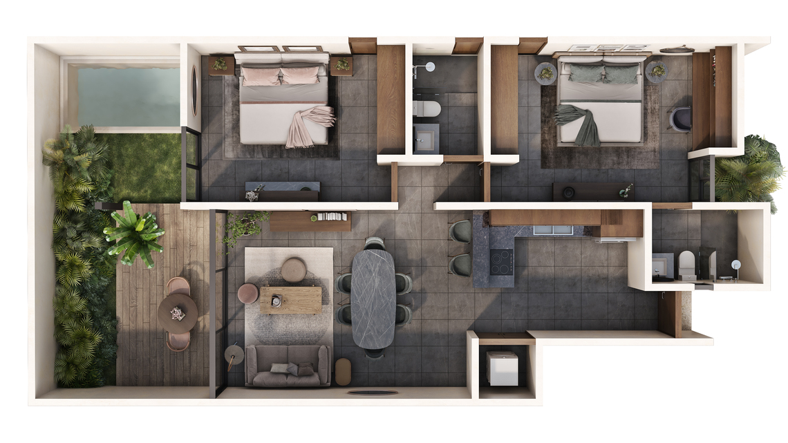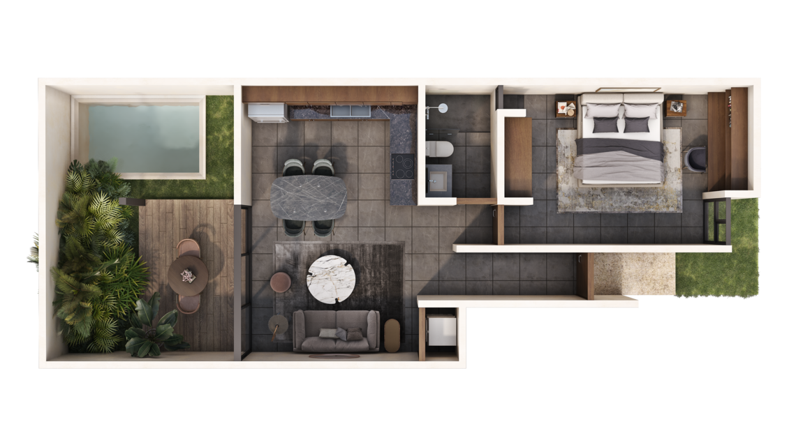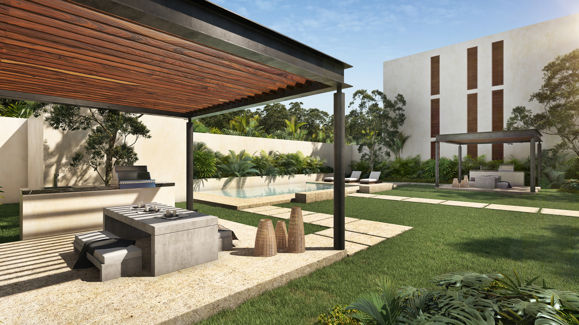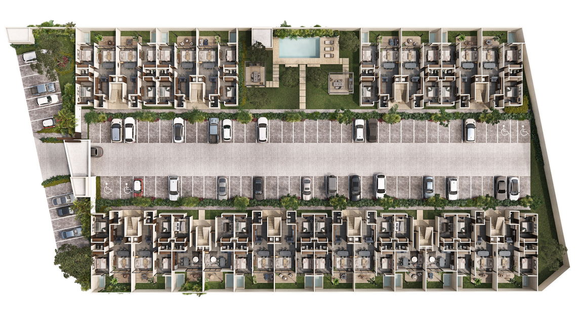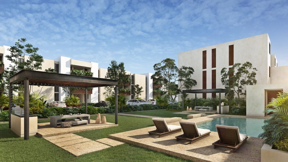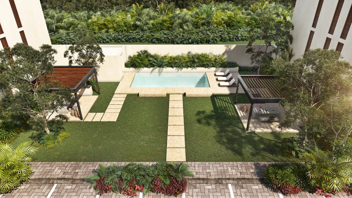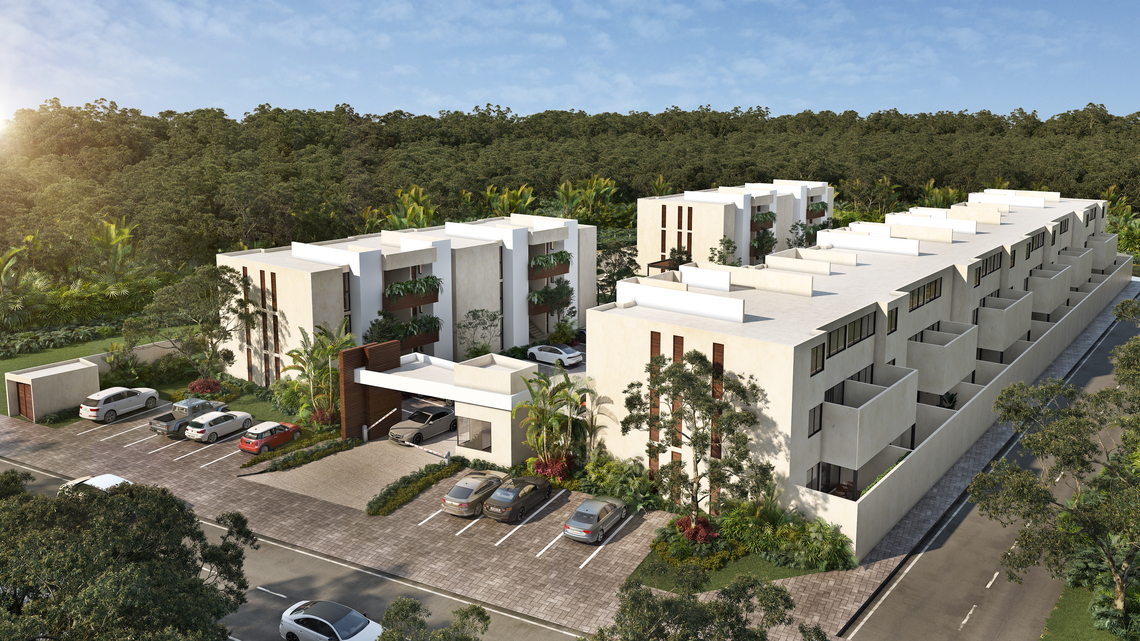 Es un proyecto inmboliriario de 60 departamentos dentro de una privada con caseta de vigilancia y plumas de acceso 24hrs, piscina en área común, zonas para convivir con familia u amigos ya aptas para disfrutar, estas viviendas están distribuidas en dos edificios horizontales con un área común grande ,de con excelentes acabados y amenidades, el desarrollo esta compuesto por 48 departamentos de 2 recamaras y 12 de 1 recamara